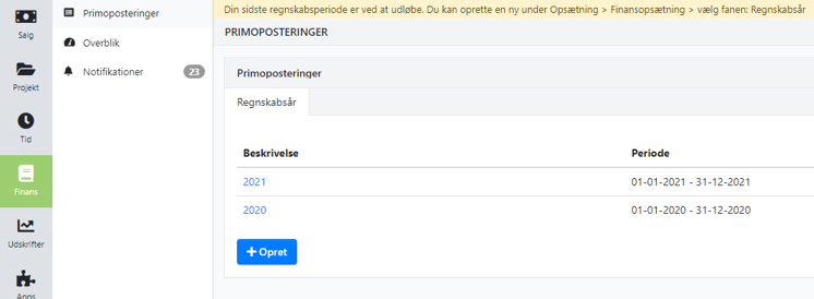 Følg linket øverst på siden i EG One eller gå i Finans -> Primoposteringer og tryk opret